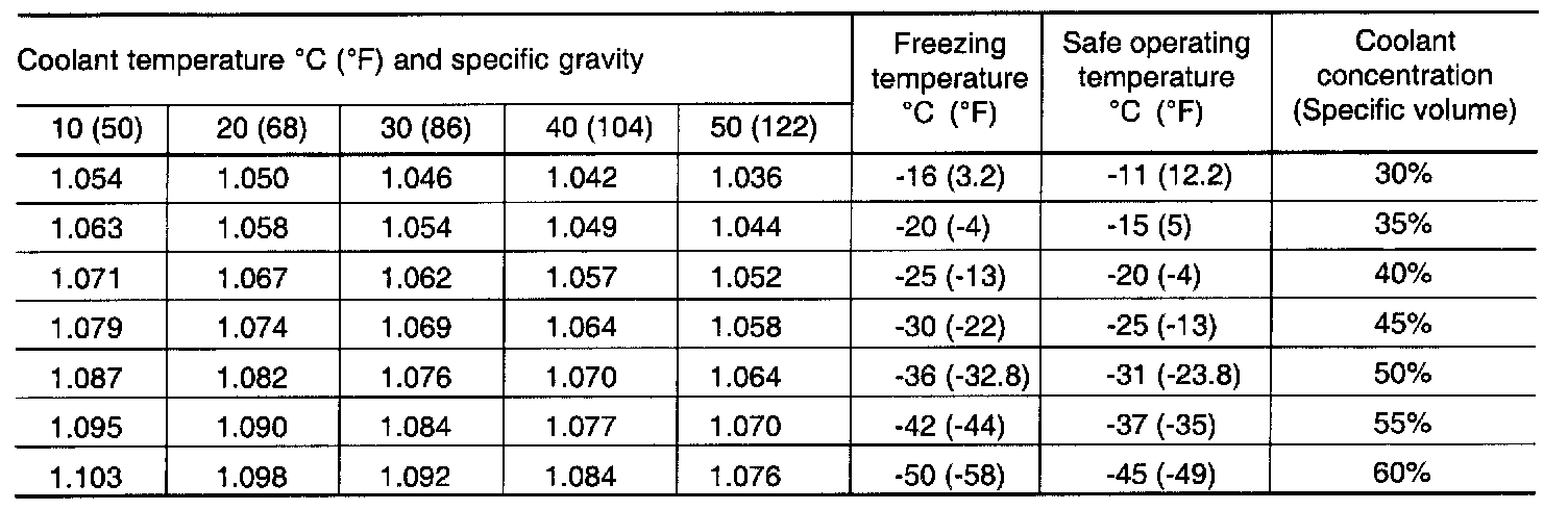 ^ If the concentration is above 60%, both the anti-freeze and engine cooling properties will decrease, affecting the engine adversely. For these reasons, be sure to maintain the concentration level within the specified range.