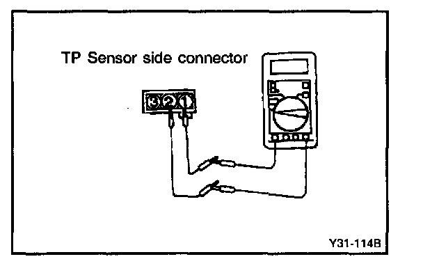 6. Slowly turn the throttle position sensor clockwise until you find a point at which there is no continuity between terminal 1 and 2. then, tighten the throttle position sensor mounting bolt securely.