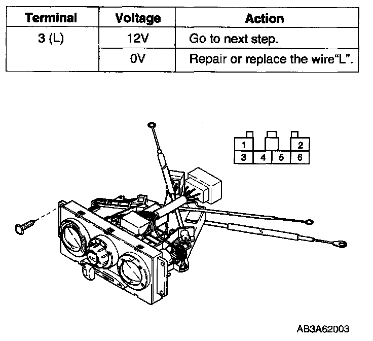 6. Check voltage between the terminal 3(L) and following terminal of A/C switch connector G-05.