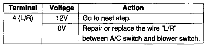 7. Check voltage between the terminal 3(L) and following terminal of A/C switch connector G-05.