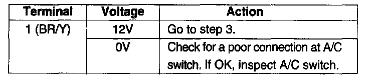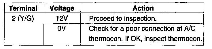 3. Connect a test light between the terminal 2 (Y/G) and C (BR/Y) of A/C thermocon connector G-06.