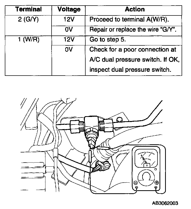 4. Check voltage at following terminal of A/C dual pressure switch connector G-07.