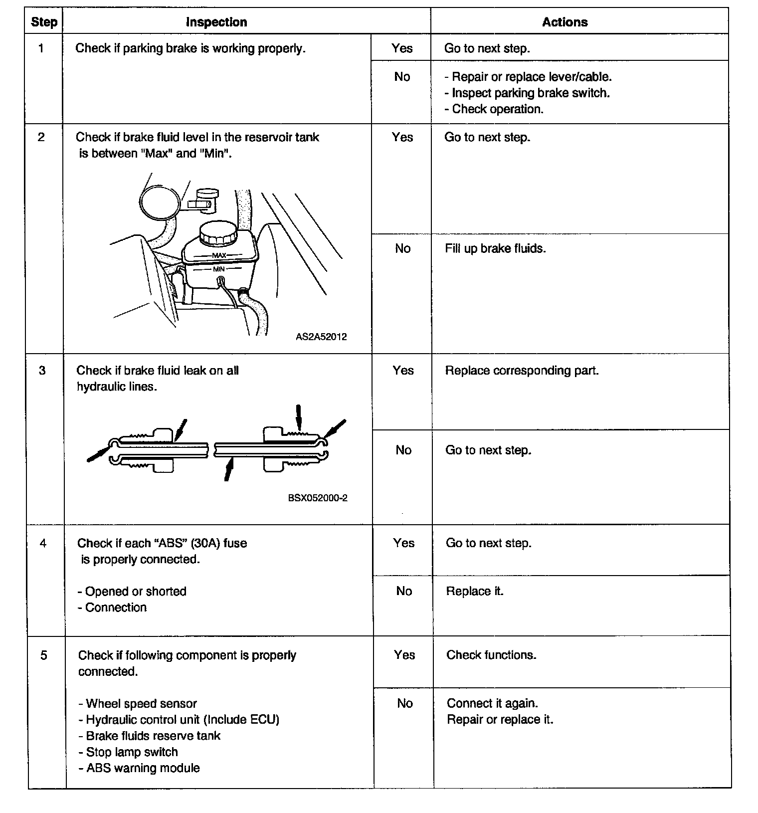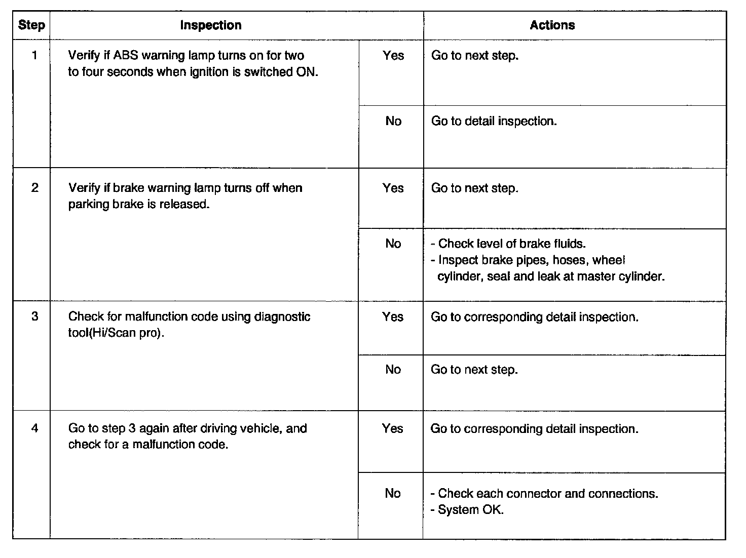 - If brake warning lamp and ABS Warning lamp turn on at the same time, Go to detail inspection after checking error code of ABS unit. Because of EBD fail.