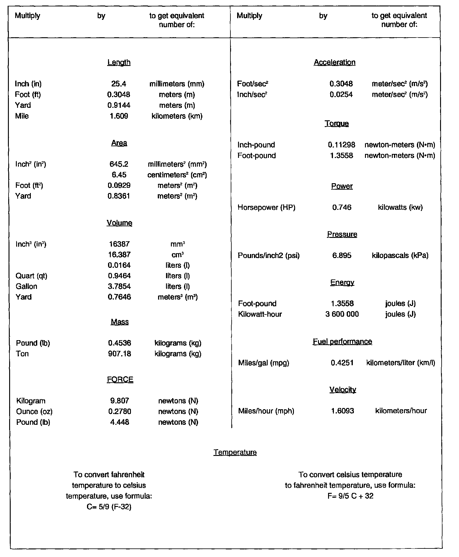 English/Metric Conversion Table: