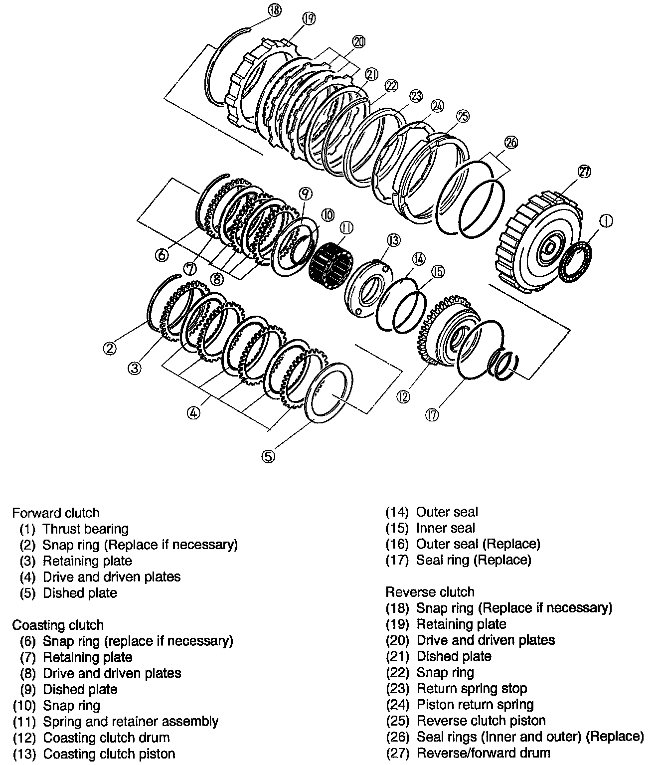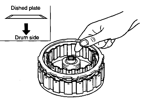 1. Remove snap ring, retaining plate, drive plates, driven plates and dished plate of forward clutch.