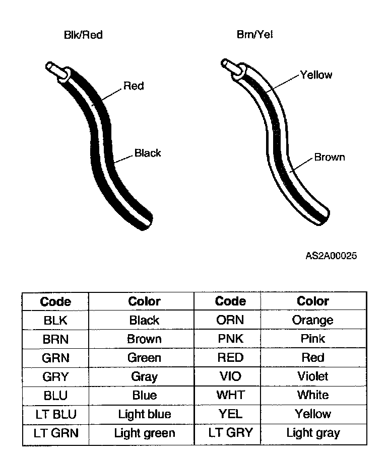 Two-color wires are indicated by a two-color code symbol. The first color indicates the base color of the wire; the second color indicates the color of the stripe.