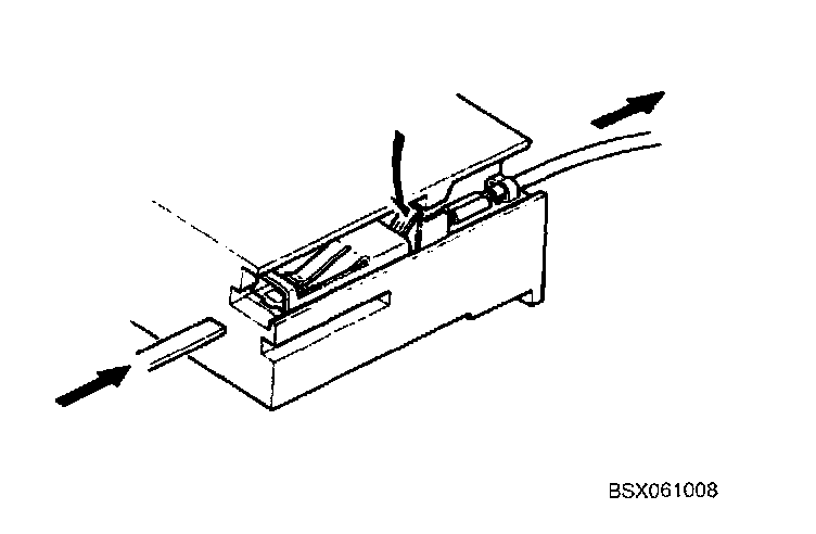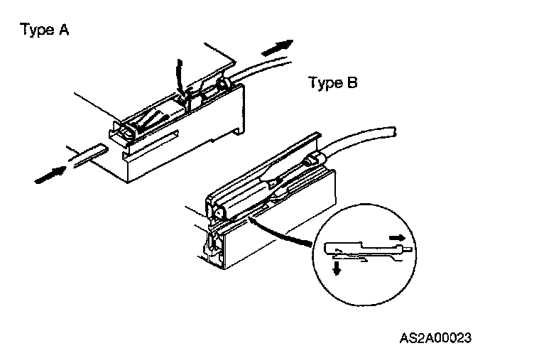 Insert a thin piece of metal from the terminal side of the connector, and then, with the terminal locking tab pressed down, pull the terminal out of the connector.