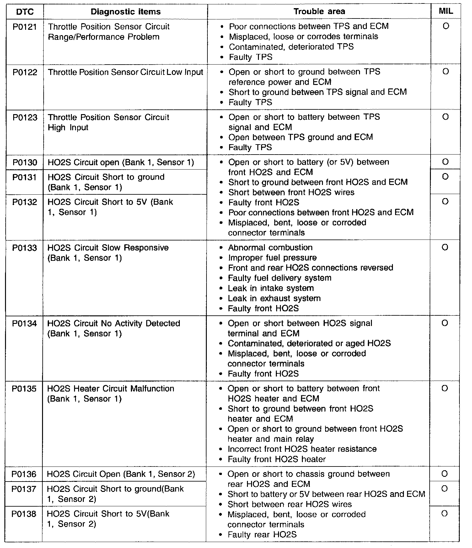 P0121 - P0138: