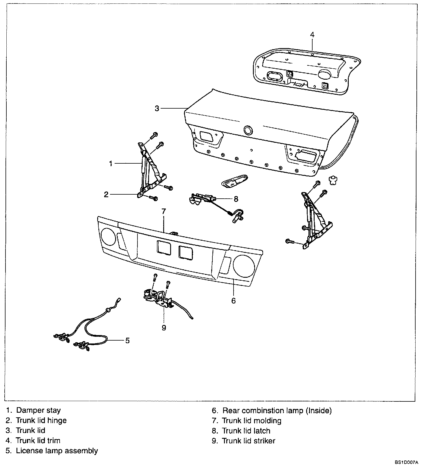5. Remove four trunk lid installation bolts and then remove trunk lid.
