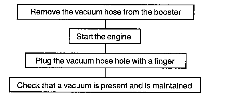 3. With the engine running, depress the brake pedal and then stop the engine. Hold the pedal depressed for 30 seconds. If the pedal height does not change, the booster is in good condition. If one of the above three tests is not okay, check the vacuum hoses, and the brake booster, and make any necessary corrections. If all tests OK, unit is good.