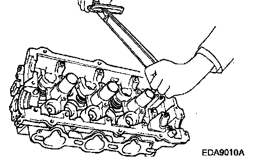 5. Using the special tool (09222-28000), compress the spring and install the retainer locks. After installation of the valves, make certain that the retainer locks are correctly in place before releasing the valve spring compressor.