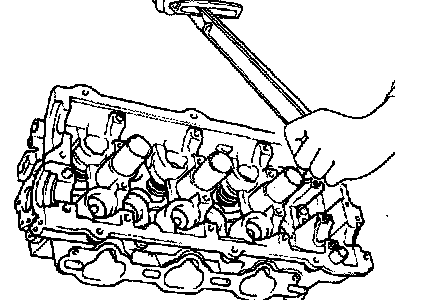 3. Apply engine oil to each valve. Insert valves into guides. Avoid forcing the valve into the seal. After installing the valve, check that it moves smoothly.