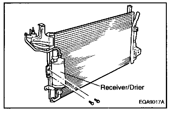2. Run the engine at fast idle with the air conditioning "ON", and check both the inlet and outlet temperatures. If the difference in temperatures between the inlet and outlet is large, replace the receiver-drier.