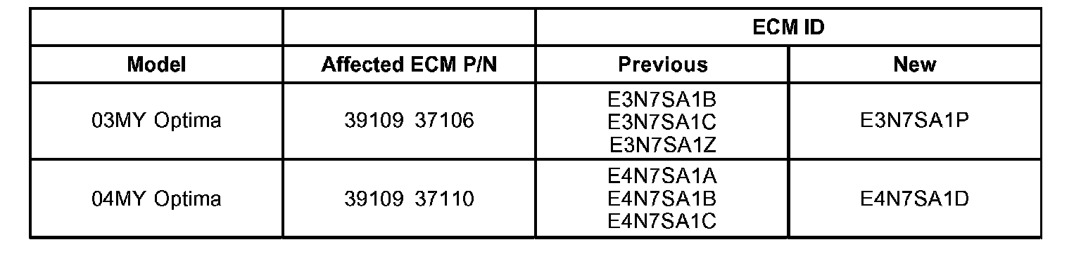 This bulletin provides information relating to an Optima ECM upgrade. Some 2003MY Optima vehicles built between 5/31/02 - 4/25/03 and some 2004MY vehicles built between 5/14/04 - 7/24/04 may experience a hesitation while driving.