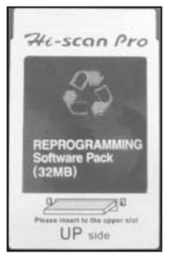 2. Remove any software cards from the Hi-Scan Pro and insert the new 32MB (blue label) reprogramming card into the Hi-Scan Pro top slot. Use the most current reprogramming software.