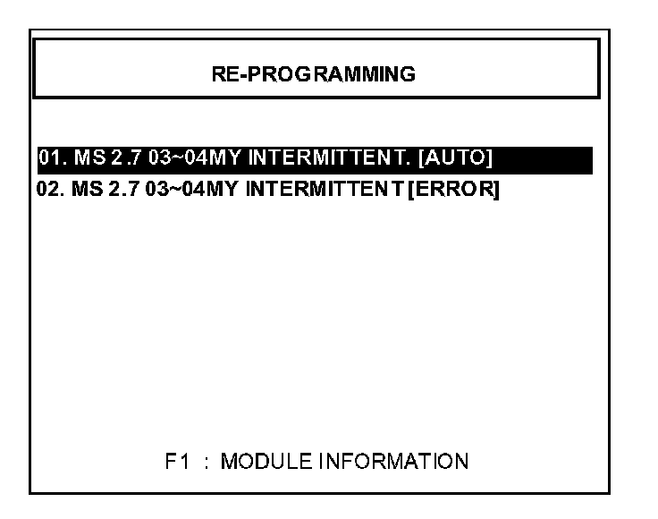 4. Select Option "02. MS 2.7 03~04MY INTERMITTENT [ERROR]" for manual reprogramming and press ENTER.