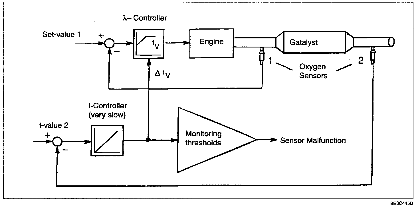 The sensor aging is monitored by comparing the front and rear HO(2)S and also using the correction value (Tv) which determines the mean value of the lean/rich shift necessary for optimal air/fuel ratio-control. With the help of this information, the ECM can make allowance for aging of the front HO(2)S in its injection period calculations. When the parameter-Tv is above or below the specific limits, the ECM will set the diagnostic trouble code HO(2)S Slow Response by aging.