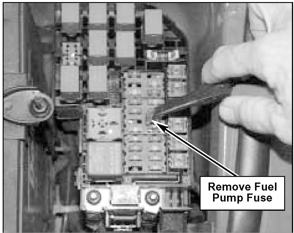 1. Open hood, remove fuse box cover and remove fuel pump fuse. Attempt to start engine, crank engine for an additional 10 seconds to remove fuel pressure.