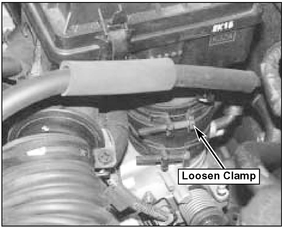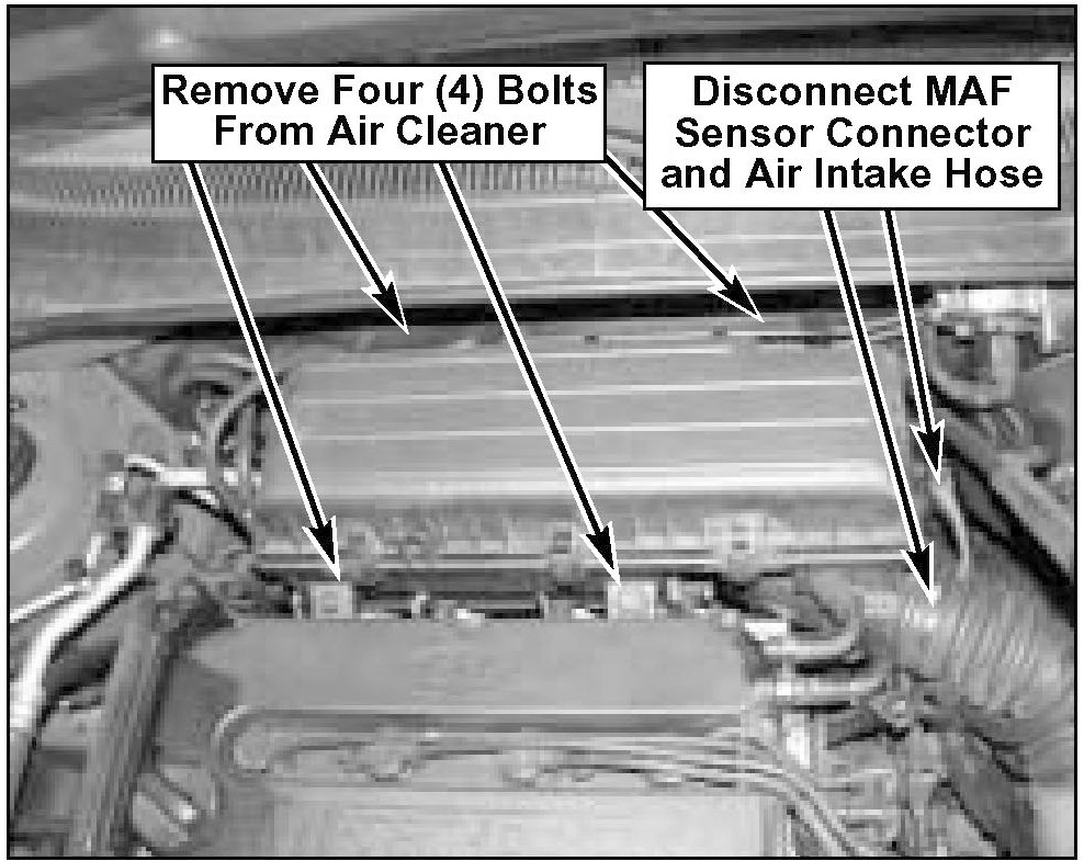 4. Disconnect MAF sensor connector, loosen clamp at air intake hose and remove hose from air cleaner.
