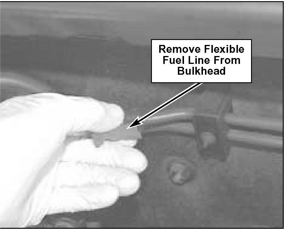 9. Remove flexible fuel line at bulkhead end by pushing line toward bulkhead and installing fuel line removal tool (see TSB Fuel 005, Quick Connect Fuel Line Tool). Pull gently on tool and flexible line to remove from steel line. (Use a shop towel to catch any residual fuel.)