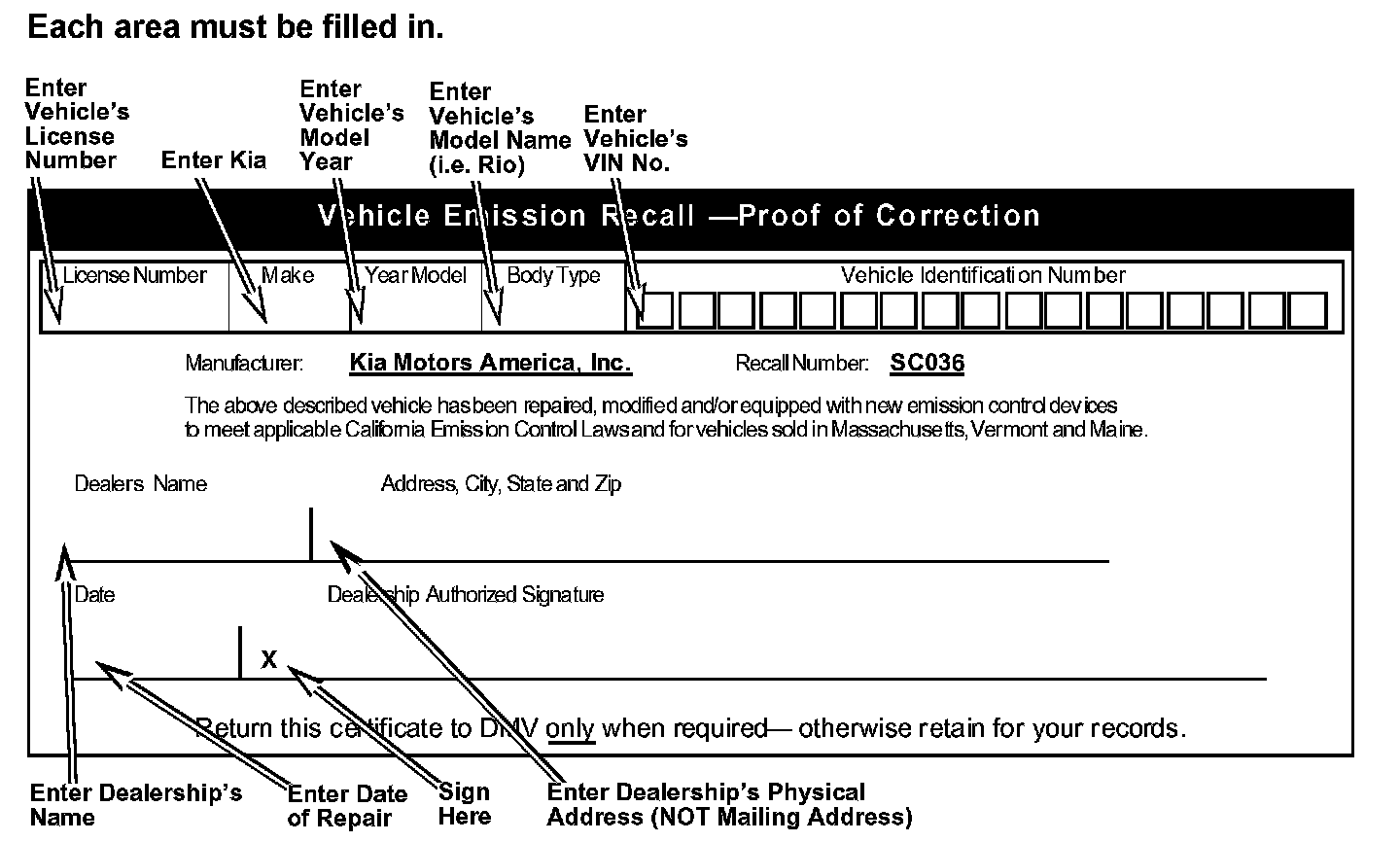 A Vehicle Emission Recall - Proof of Correction card must be filled out for all vehicles registered in California, Massachusetts, Vermont, and Maine.