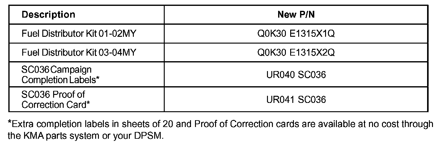 An initial inventory of the Fuel Distributor Kits will be shipped to all dealers to coincide with the recall announcement.