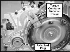 When installing a replacement automatic or manual transaxle assembly into a front-wheel drive vehicle, it is very important to leave the plastic axle-seal plugs in place until it is time to reinsert the axle drive shafts. The axle-seal plugs prevent the differential sidegears from becoming dislodged from their proper positions. If the differential side-gears become dislodged, it will NOT be possible to reinsert the axle drive shafts. If the differential side-gears cannot be returned to their proper positions, it will be necessary to install another replacement transmission assembly, as correction of this condition requires disassembly of the transmission housing.