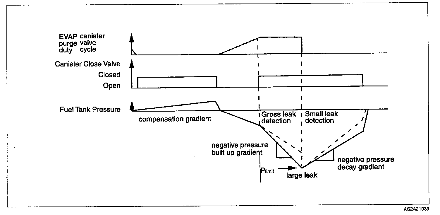 The canister close valve and the EVAP canister purge control valve are closed and an increase in fuel tank pressure caused by fuel evaporation occurs (compensation gradient). Afterwards, the canister close valve and the purge control valve are opened. The canister close valve will be shut if the purge control valve reached its final duty cycle.