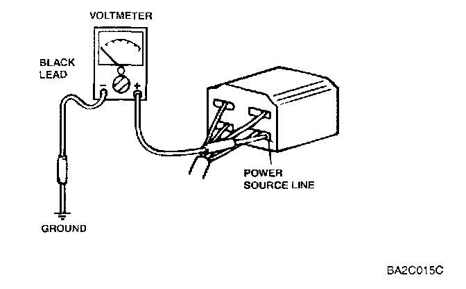 The DC voltmeter measures circuit voltage. A voltmeter with a range of 15V or more is used by connecting the positive (+) probe (red lead wire) to the point where voltage is to be measured, and the negative (-) probe (black lead wire) to a body ground.