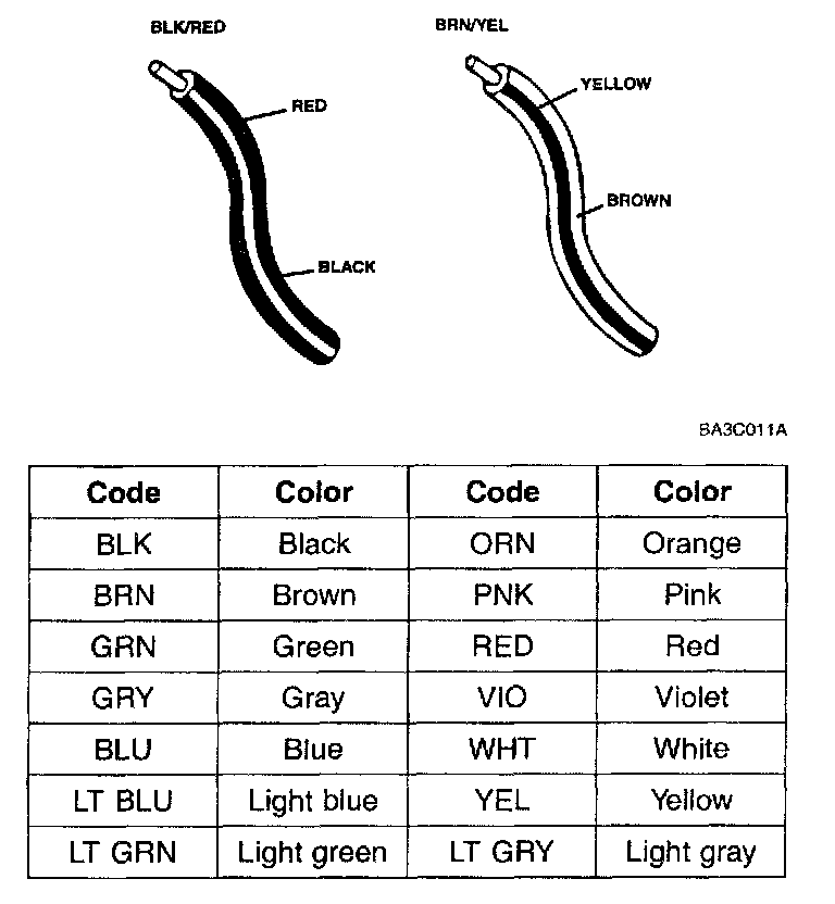 Two-color wires are indicated by a two-color code symbol. The first color indicates the base color of the wire; the second color indicates the color of the stripe.