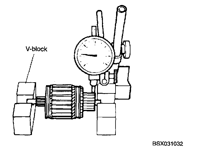 3. Place armature on V-blocks, and measure runout with a dial indicator. If runout is not within specification, repair armature with a lathe or replace armature.