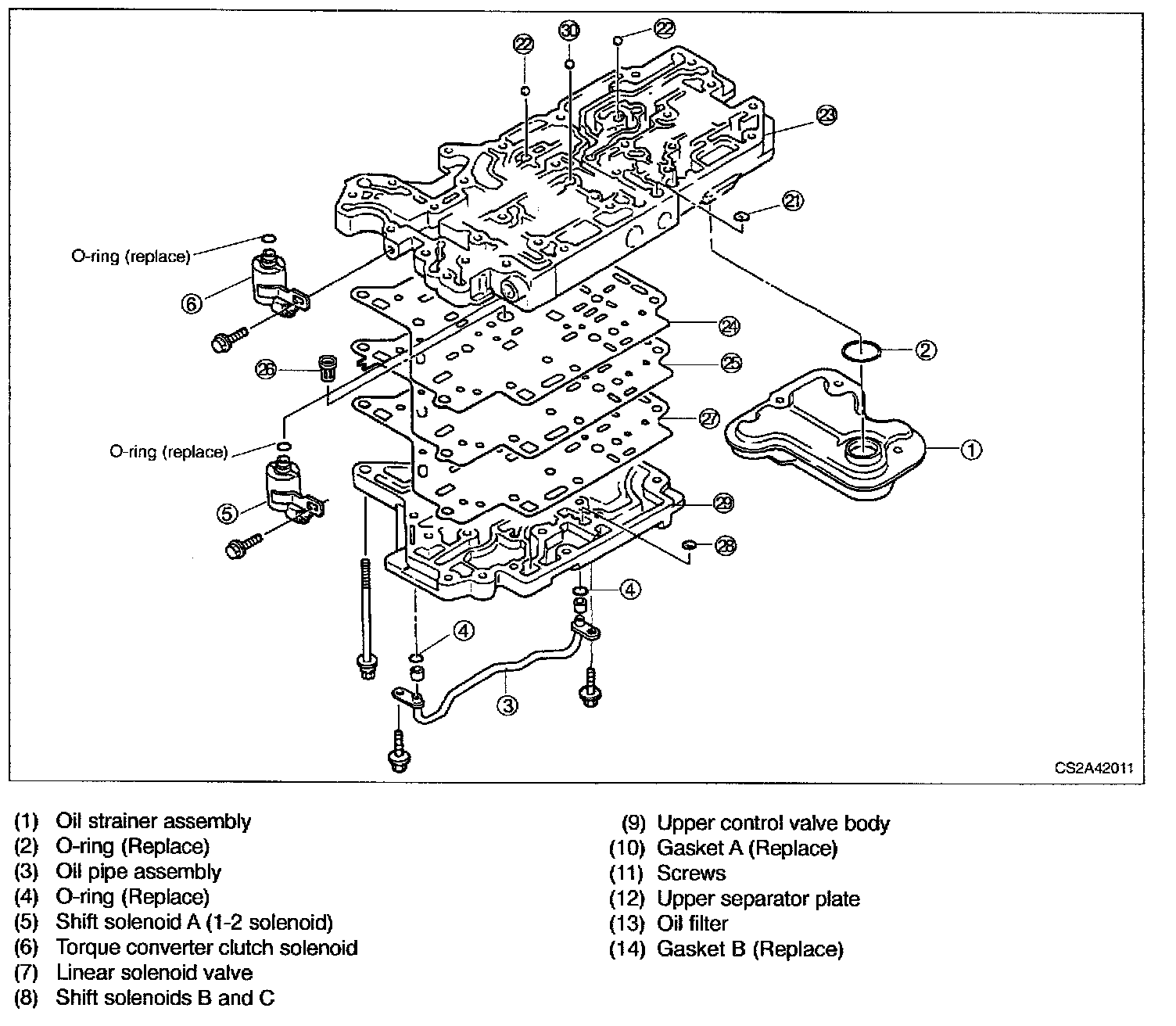 20. Install shift solenoid A and oil strainer onto upper valve body.