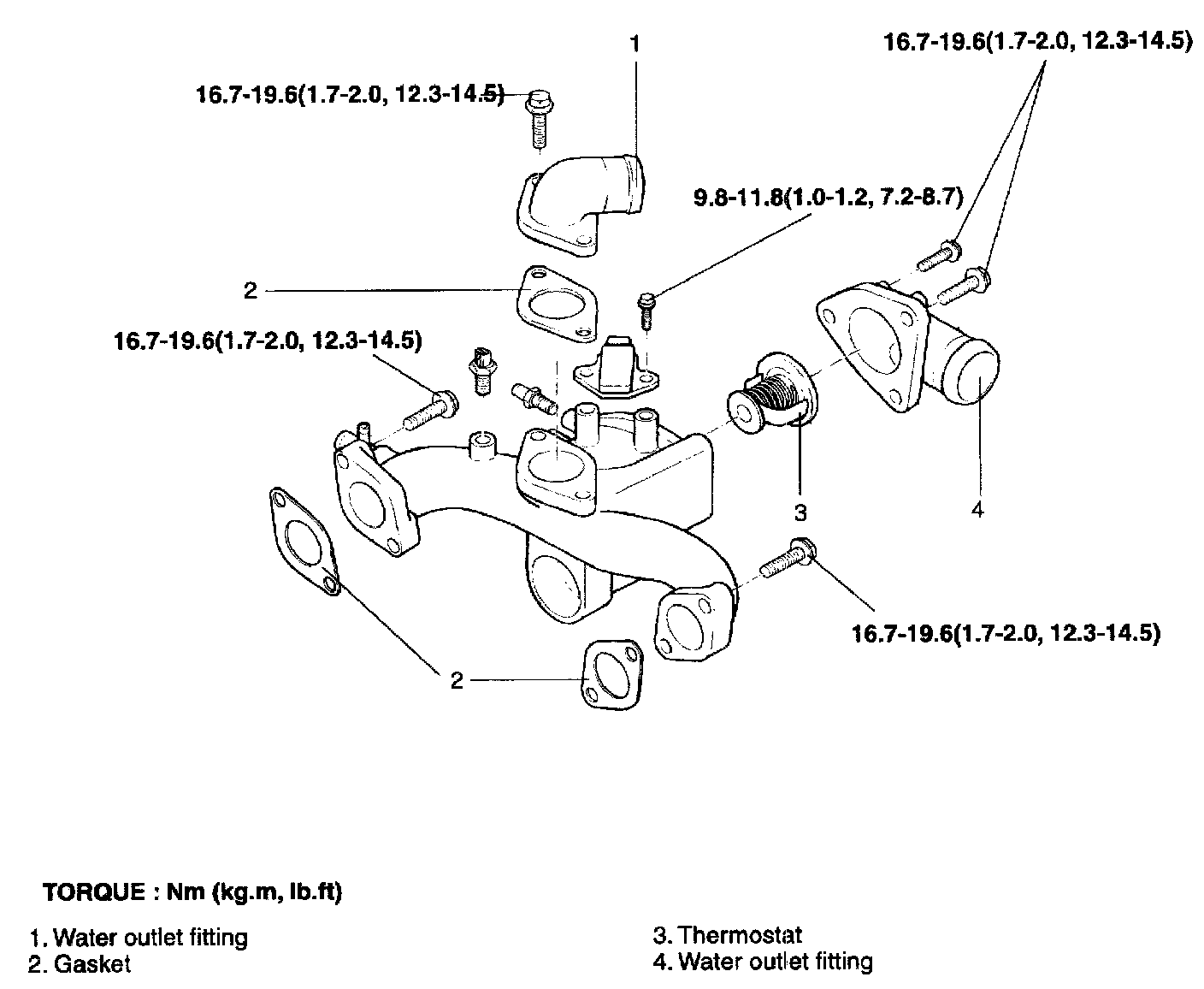 Engine coolant inlet fitting bolt: 17 - 20 Nm (1.7 - 2.0 kg-m, 12 - 14 ft. lbs.)