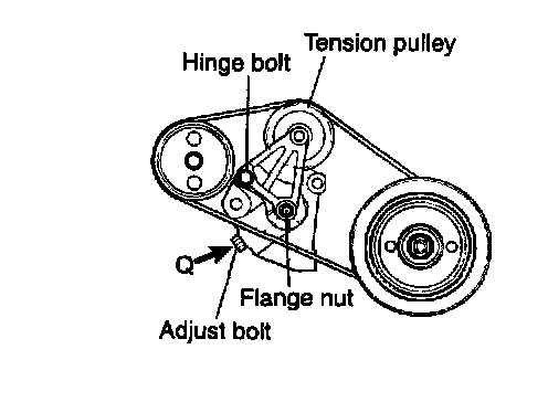 3. Temporarily install hinge bolt and flange nut not to tensioner pulley run out - Adjust belt tension - tighten adjust bolt and flange nut to the specified torque