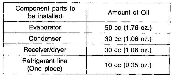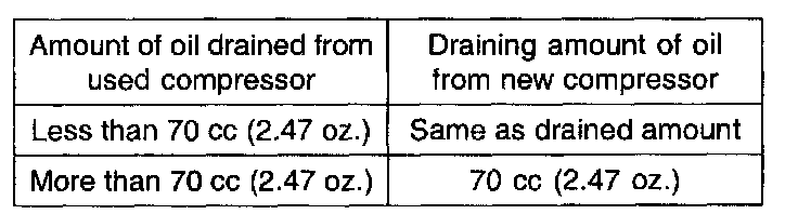 150 cc (5.29 oz.) of oil is charged in compressor (service parts). So it is necessary to drain the proper amount of oil from the new compressor.