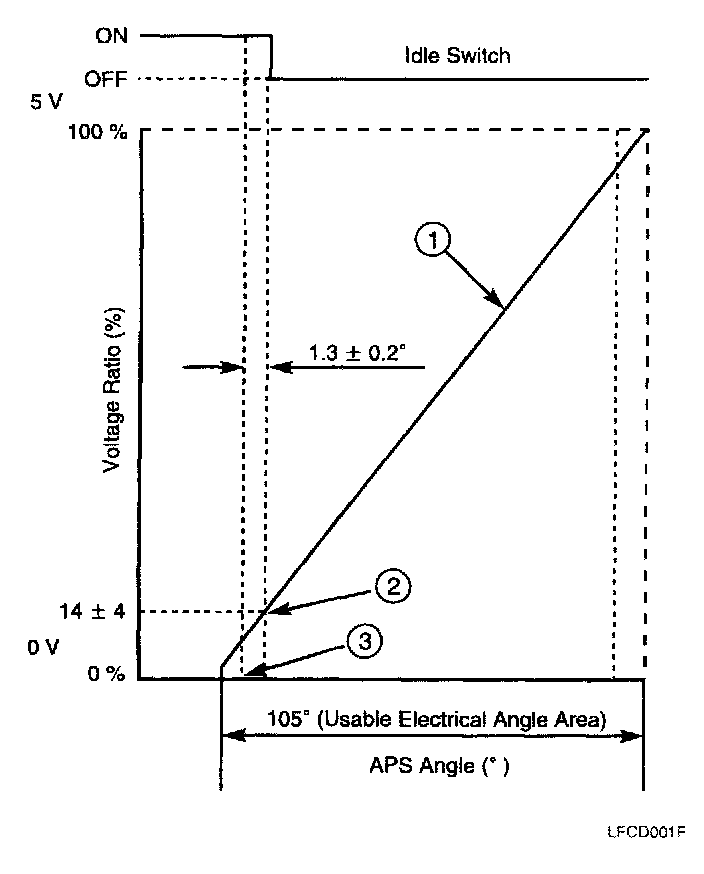 5. Replace the APS if the sensor signal is out of range and is not directly proportional to the accelerator pedal angle.