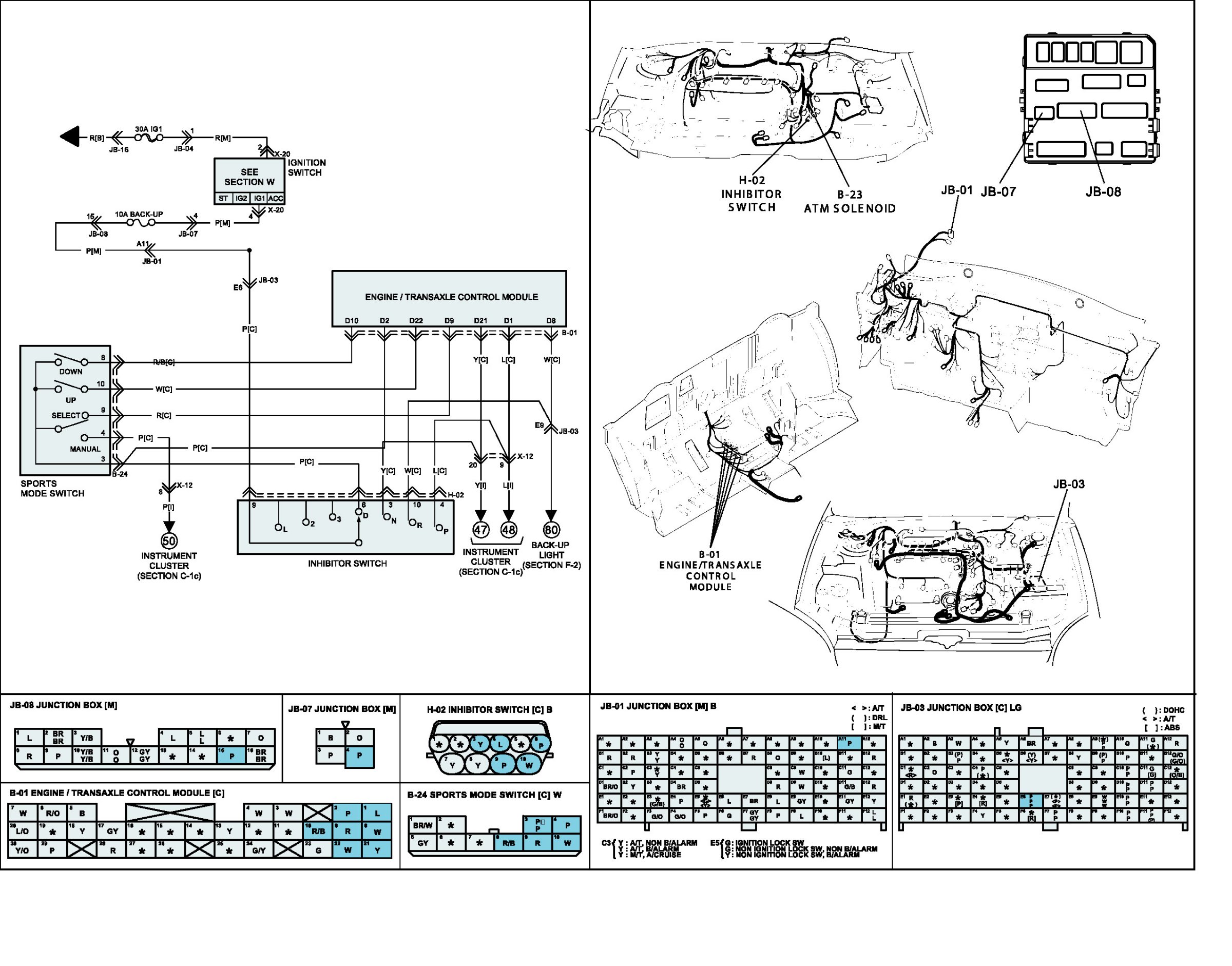 The Transaxle Range Switch sends the shift lever position information to the TCM (PCM) using a 12V (battery voltage) signal. When the shift lever is in the D (Drive) position the output signal of Tansaxle Range Switch is 12V and in all other positions the voltage is 0V. The TCM (PCM) judges the shift lever position by reading all signals, for the Transaxle Range Switch, simultaneously.