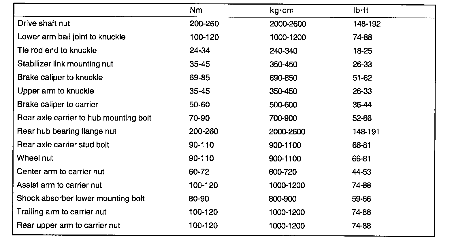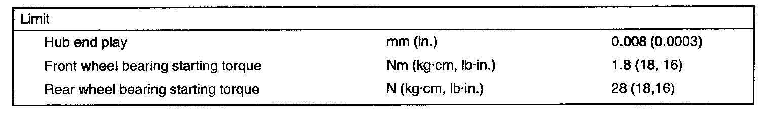 Rear wheel bearing starting torque 28 N (18 kg cm,16 in lbs)