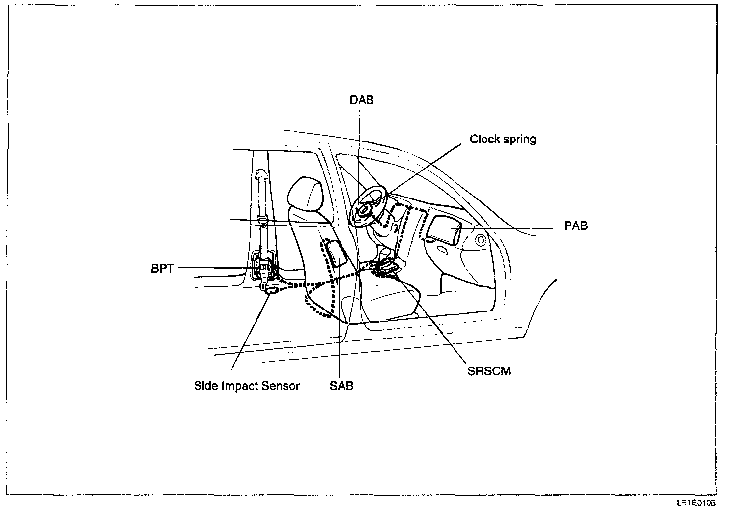 AIRBAG MODULE (DAB, PAB, SAB)DAB (Driver airbag), PAB (Passenger airbag) module and SAB (Side Airbag) are comprised of inflator and cushion. The initiator (A gas generator igniting device) is assembled in the inflator. When the vehicle is in a frontal or side crash of sufficient force to close the sensor of SRSCM, current is developed through the deployment loop. Current passing through the initiator ignites the material in the DAB and PAB module or SAB module and inflates the airbag.
