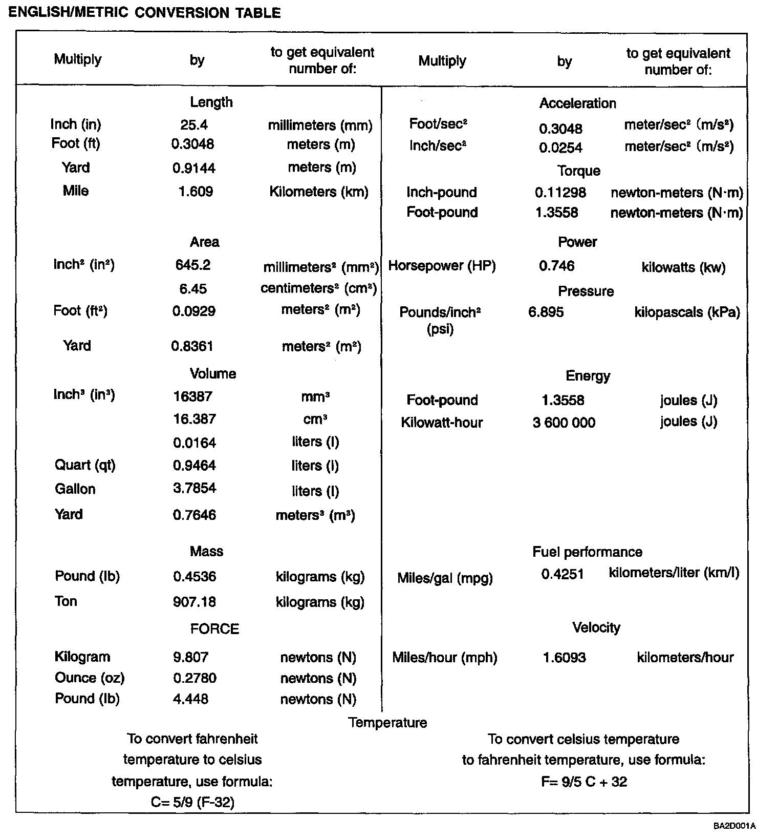 English/Metric Conversion Table: