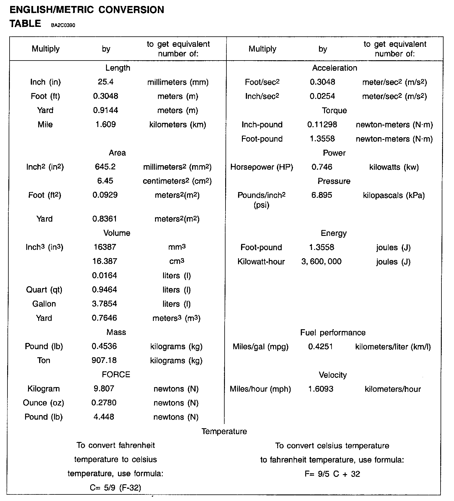 English/Metric Conversion Table: