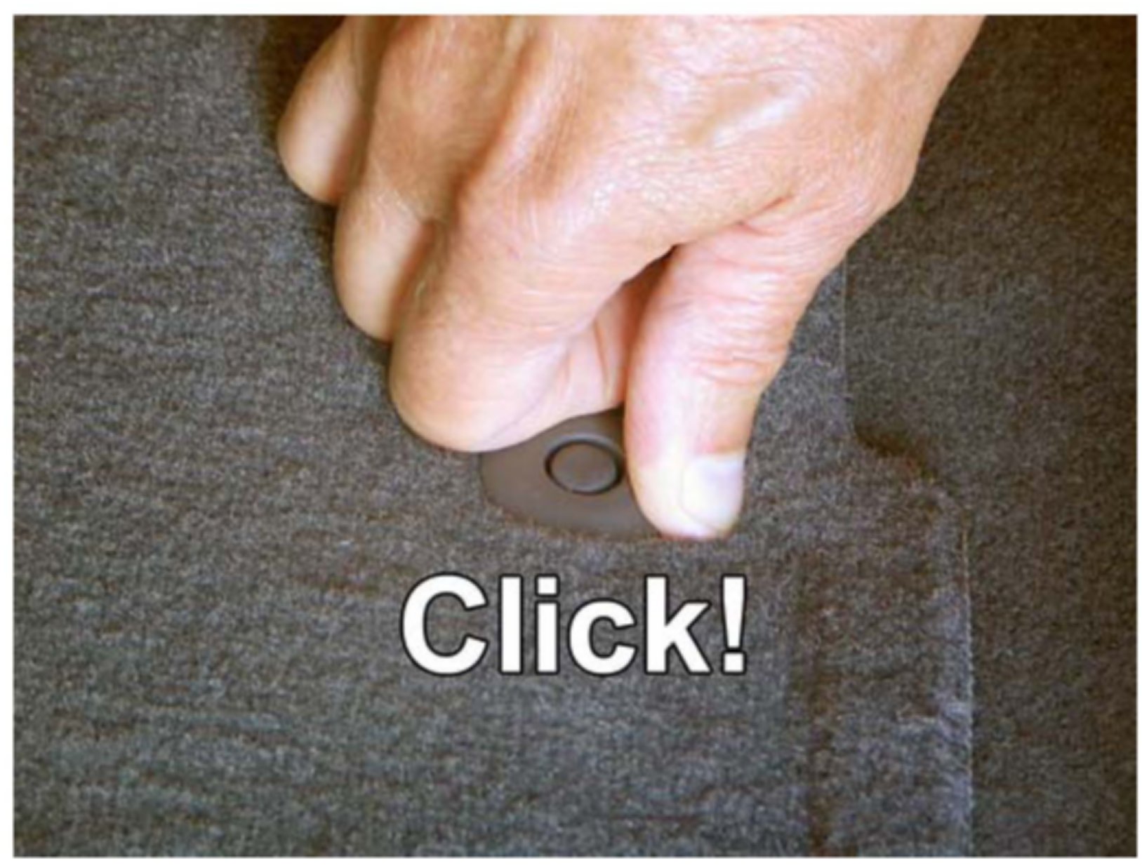 During installation, floor mats must be locked in place using the carpet retension post or carpet hooks, if so equipped. On vehicles equipped with carpet retension post, the mats must be fully inserted over the retension post with significant downward pressure to cause a "click" sound to occur, indicating that the floor mat has properly installed and locked onto the retension post.