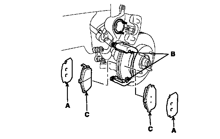 3. Install the brake pads (B) and pad shims (A) correctly. Install the pad with the wear indicator (C) on the inside.