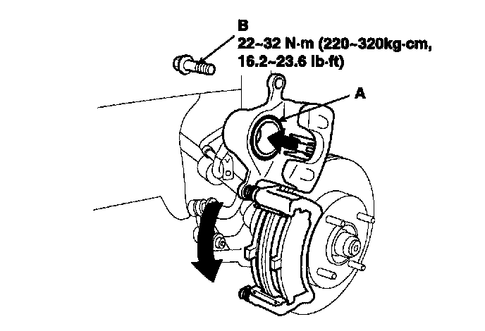 5. Pivot the caliper down into position. Being careful not to damage the pin boot, install the guide rod bolt (B) and torque it to proper specification.