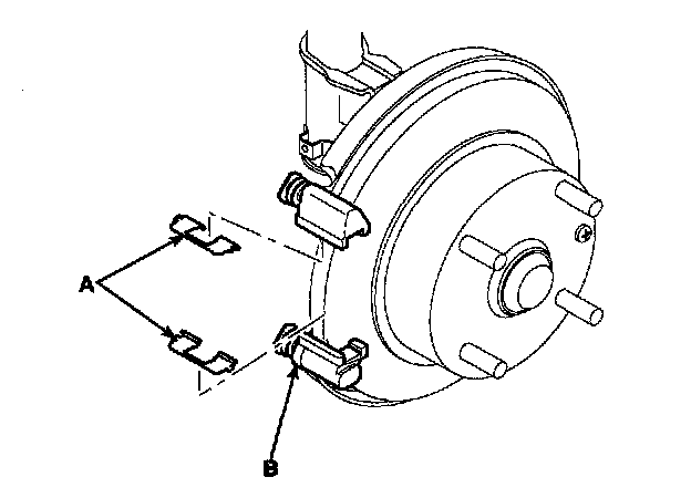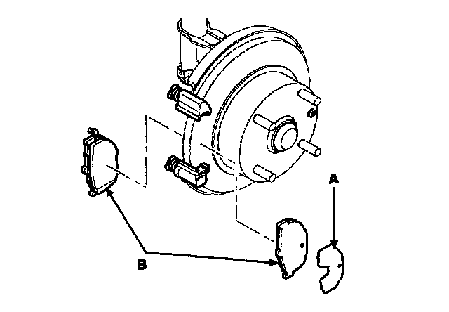 2. Check the foreign material at the pad shim (A) and the back of the pads (B).