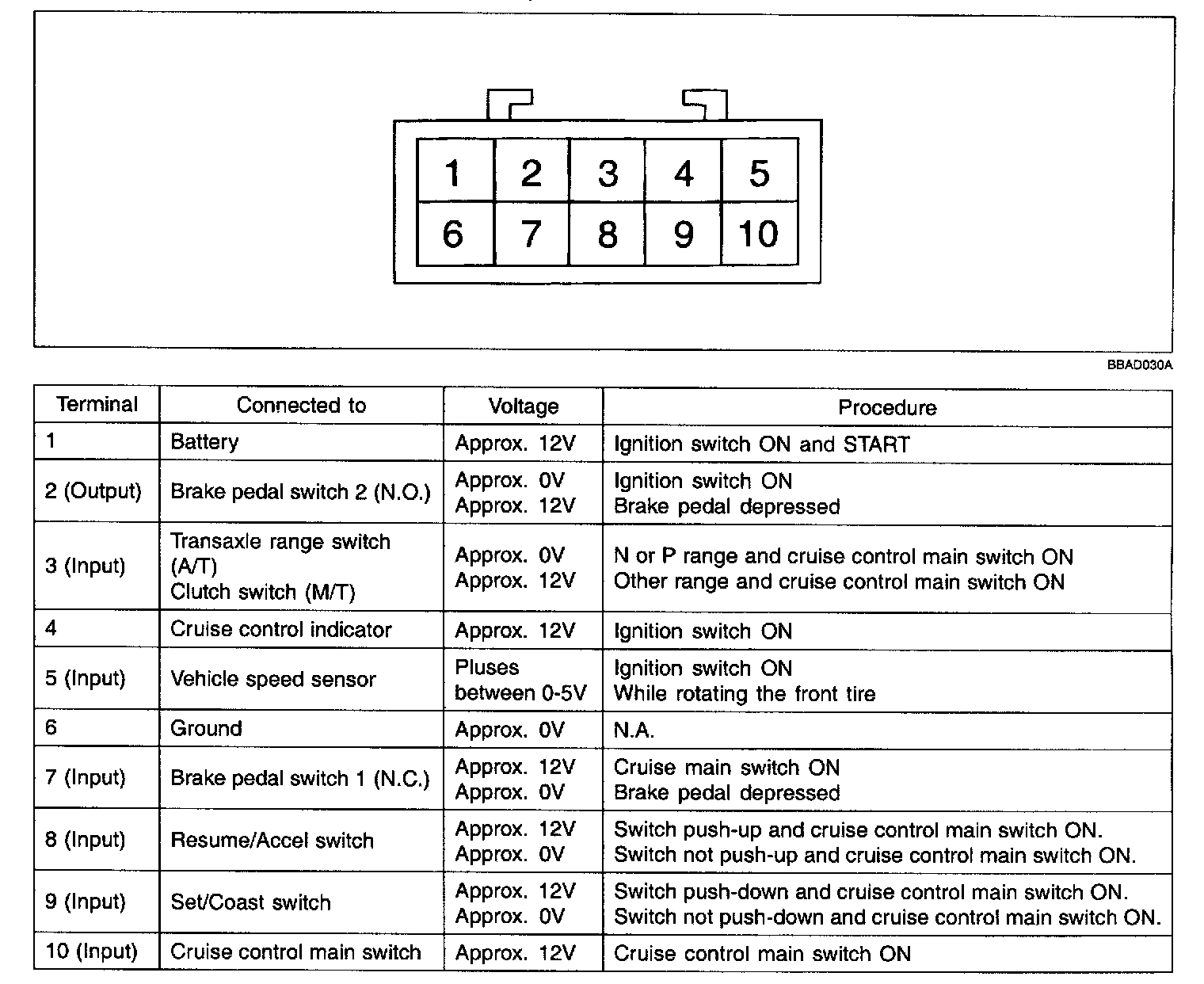 Connect a voltmeter between cruise control unit terminals and ground (Connector Q01 connected)