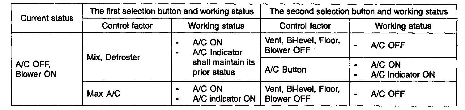 1. At initial battery application, A/C OFF (A/C ON when the mode is mix. defroster. MAX A/C when the Blower is ON)