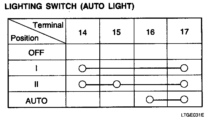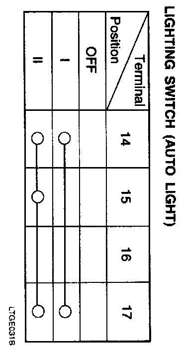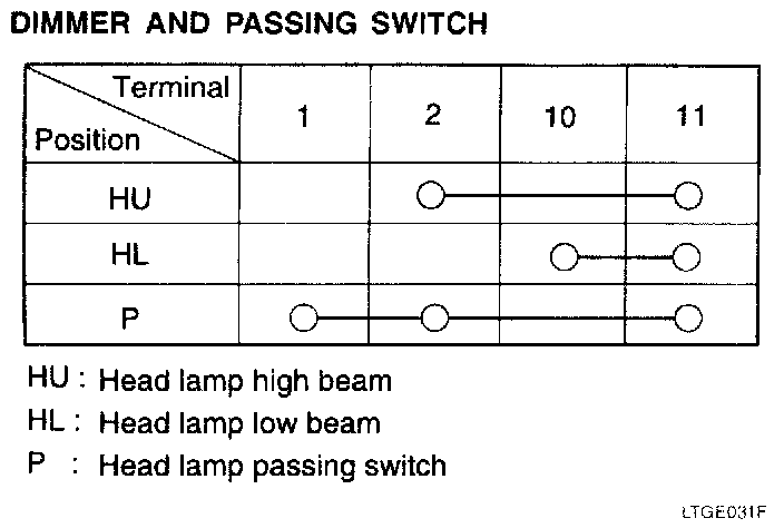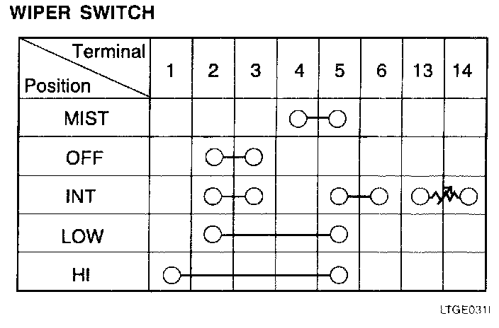 With the multi function switch in each position, make sure that continuity exists between the terminals below. If continuity is not as specified, replace the multi-function switch.