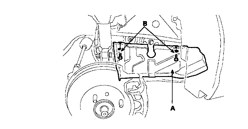 3) Remove the bolt (B) and engine support bracket stay plate (A).