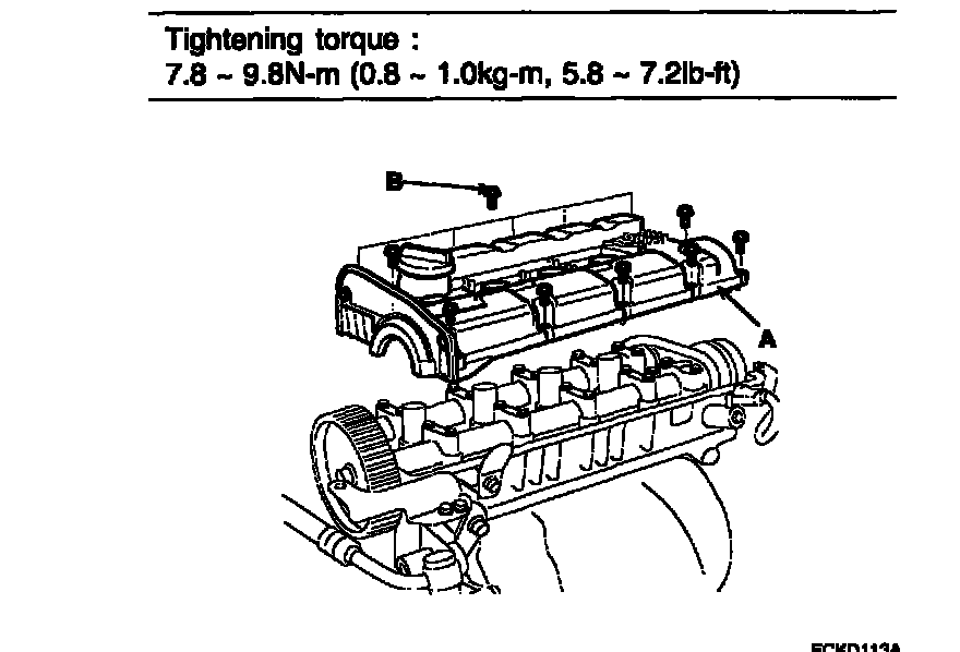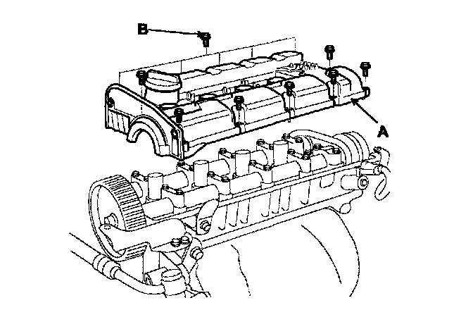 10. Remove the 4 bolts(B) and timing belt upper cover (A).